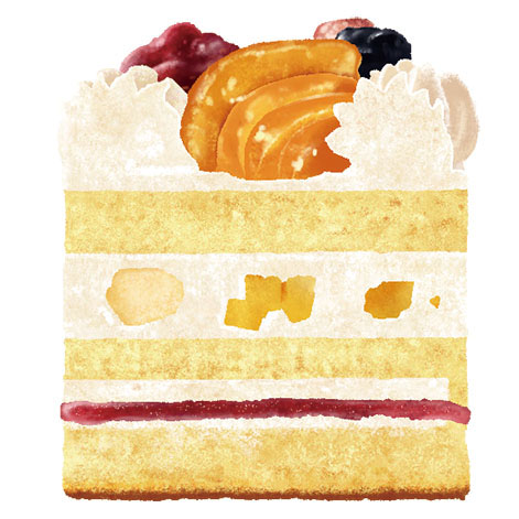 角切りのりんごシロップ漬けをサンドし、4種のフルーツを飾ったショートケーキです。