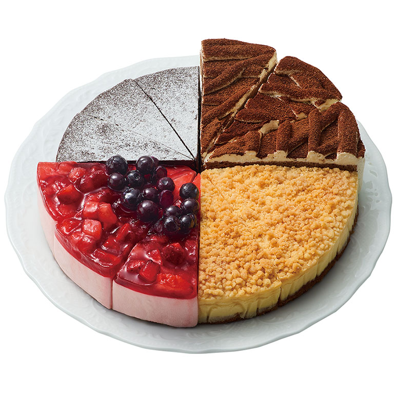 人気のフレーバー4種のガトーショコラ、チーズケーキ、ティラミストルテ、ベリームースが1度に楽しめるアソートケーキです。