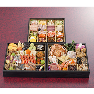 ◆壱の重/かにほぐし身甲羅盛り(かに酢ジュレ)、炙りのどぐろ松葉、牛しぐれ笹包み、くるみ餅(赤)、くるみ餅(白)、紅白市松かまぼこ、つくね、えび真薯、小松菜と揚げ煮物、数の子、刻み昆布柚子皮入り、いくらなます、一口昆布巻、穴子八幡巻、生ハム、紫キャベツラぺ、かに爪、きんかん煮、まぐろ昆布、小鯛ひしお焼