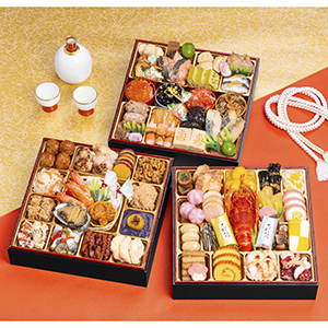 ◆三の重/柚子鶏つくね、鶏の三色巻、こんにゃく旨煮、紅鮭白醤油焼、若桃甘露煮、湯葉旨煮、新緑ふくさ、長寿貝の中華風、ままかり酢漬け柚子風味、紅白結び餅、紅白なます、いくら醤油漬、金箔黒豆、紅鮭の石狩漬、松前漬、チーズインミート、牛肉ごぼう時雨煮、柚子くらげ、海老紅白奉書、椎茸旨煮、寿高野豆腐、鰆西京焼、柚子オーロラ
