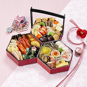 縁起の良い亀甲型の手桶三段重に、色とりどりの祝い料理を31品目詰合わせ、少人数のご家族でも楽しんでいただけるように仕上げました。