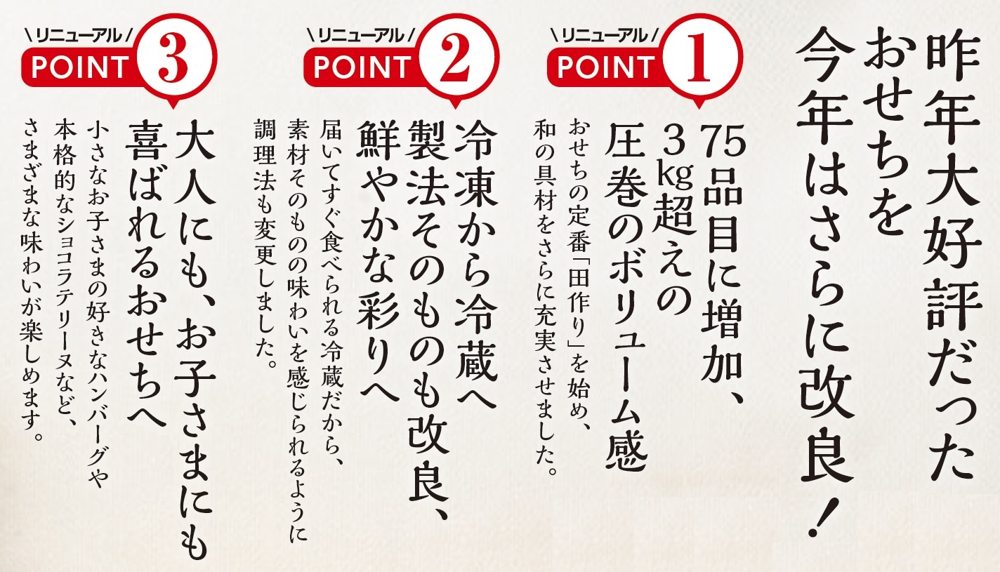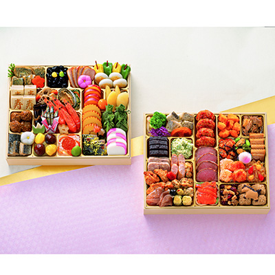 ◆一の重/鯖の南蛮漬、梅花人参旨煮、黒豆煮、くり豆、うぐいす豆、合鴨スモーク、花餅(紅梅)、粟麩串、蓬麩串、チーズ味クリーム入りかまぼこ、寿高野煮、彩り野菜の煮〆、彩り水菜、あわび旨煮、さつま芋レモン煮、金柑甘露煮、松前漬、味付数の子、純輝鶏鶏の肉団子、一口昆布巻、赤花こんにゃく旨煮、白花こんにゃく旨煮、祝い海老、田作り、竹麩甘露煮、さわら幽庵焼、花餅(白梅)、紅はるかきんとん、栗甘露煮、渋皮栗甘露煮、紅白なます、いくら醤油漬、若桃甘露煮、伊達巻、笹巻団子、わかめ、こはだ粟漬、紅白松葉串、紅白かまぼこ