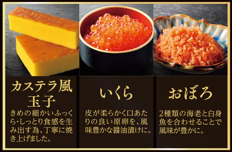 煮穴子、えび、醤油漬けいくら、漬けまぐろ、まぐろたたき、刻みたくあん、締めこはだ、千切りがり、漬け数の子、玉子焼き、きゅうり